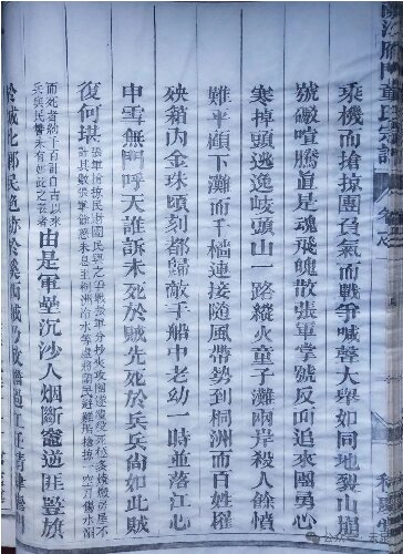 清军张玉良部杀掠兰溪民团、避难商民的情景:“溪中船筏拥拥而来,岸上人民纷纷而窜,兵乘机而抢掠,团负气而战争,喊声大举,如同地裂山崩,号砲喧腾,直是魂飞魄散。张军掌号反面追来,团勇心寒掉头逃逸,岐头山一路继火,童子滩两岸杀人,余愤虽平,顾下滩而千樯连接,随风带势到桐洲而百姓罹殃,箱内金珠顷刻都归敌手,船中老幼一时并落江心,申雪无门,呼天谁诉,未死于贼,先死于兵”。