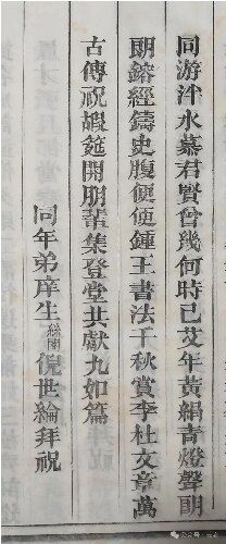 八、同年弟、庠生倪世纶(丝阁)。倪世纶与童斐然一同考取秀才,属于“同班同学”,他的祝寿诗开句:“同游泮水慕君贤,曾几何时已艾年。”惺惺相惜,又互道珍重,不愧为是老同学。