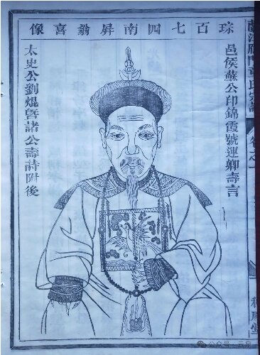 童谱中有一幅“琮百七四南屏翁喜像”,众所周知,旧时谱牒上一般多收入族人遗像,喜像(活着的时候,画像刊入家谱中)是不常见的。(人像两边有文字:邑侯苏公印锦霞号运卿寿言,太史公刘焜暨诸公寿诗附后。)