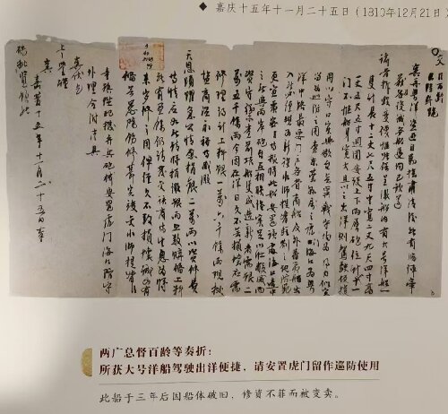 收到虎门秘档一份,是一条在二百年前( 嘉庆十五年)由時任两广总督百龄,時任广东巡抚韓崶奏报,新任广东水師提督童镇陞执行,嘉庆皇帝御批“览钦此”的朱批奏折,级別不低。